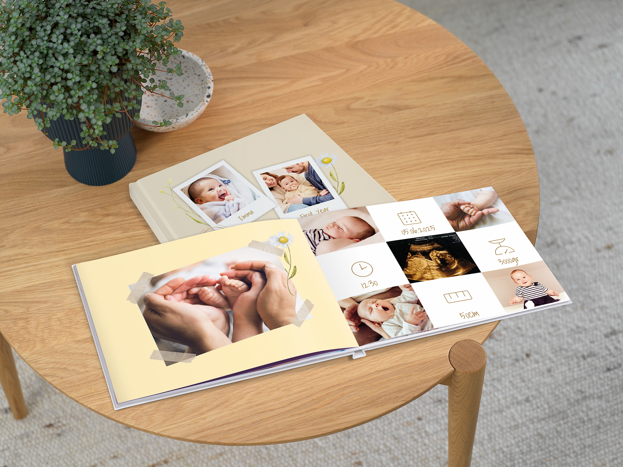 Nous recommandons de créer un album pour la naissance de votre bébé avec une couverture rigide. Cette option est particulièrement solide et durable.